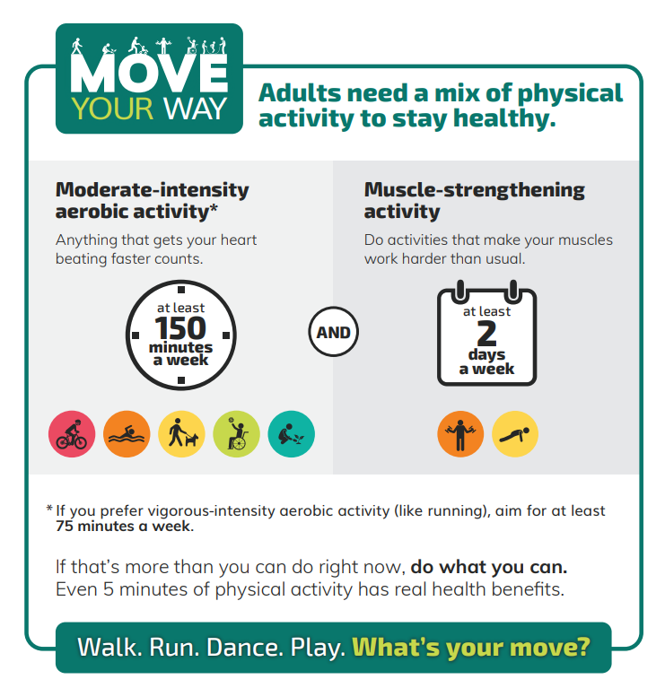 Aerobic exercise: A minimum of 150 minutes of moderate intensity aerobic exercise or 75 minutes of vigorous intensity aerobic exercise per week